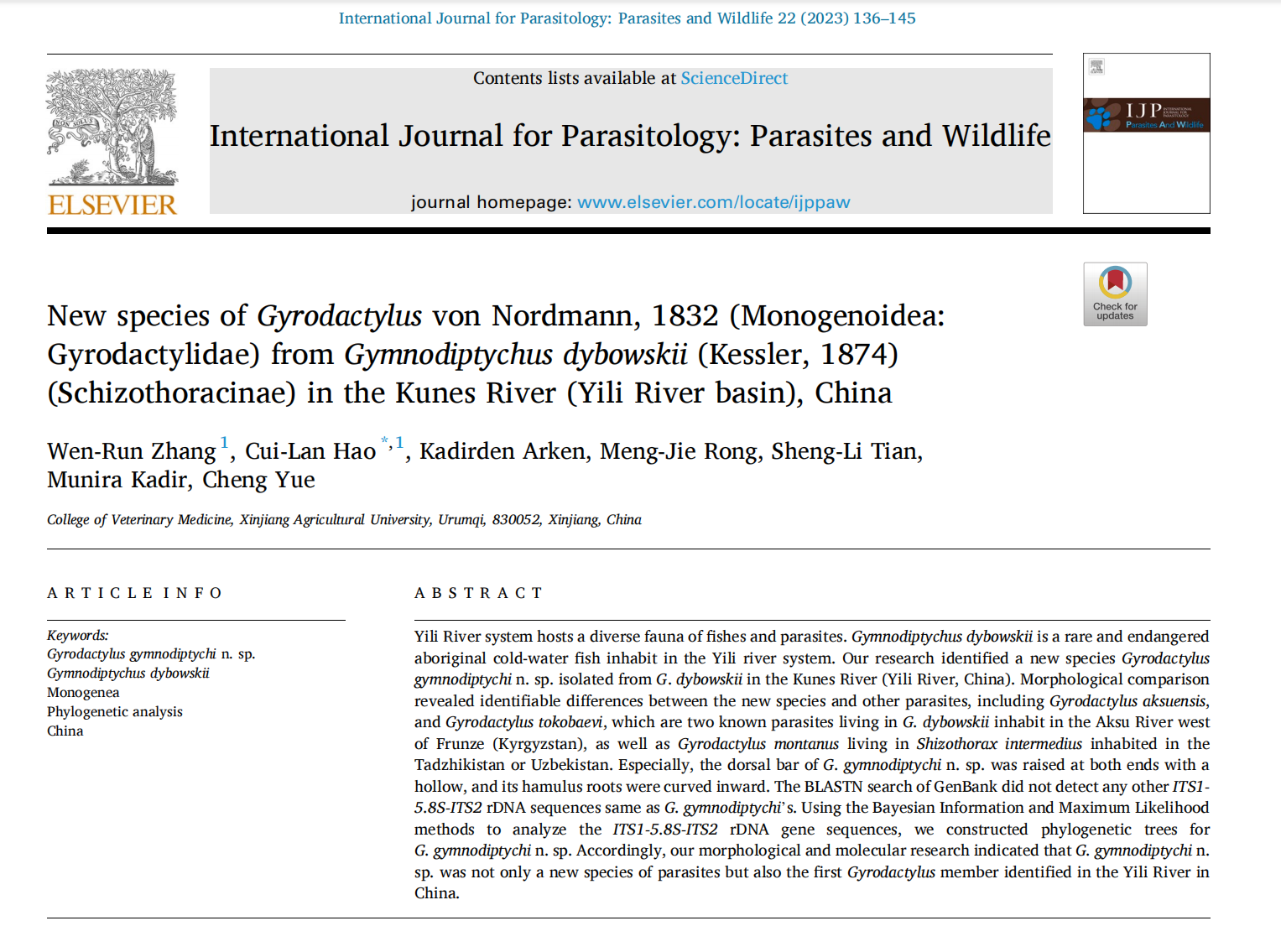 近日,99久久婷婷国产一区二区动物医学学院郝翠兰在International Journal for Parasitology: Parasites and Wildlife 在线发表了论文“New species ofGyrodactylus von Nordmann, 1832(Monogenoidea: Gyrodactylidae) from Gymnodiptychus dybowskii(Kessler, 1874) (Schizothoracinae) in the Kunes River (Yili River basin), China”的研究论文。该文报道了新疆土著鱼类新疆裸重唇鱼(Gymnodiptychus dybowskii)体表寄生的三代虫一新种,首次描述了其基本形态,结合分子生物学方法对该虫的ITS1-5.8S-ITS2 rDNA基因序列构建了系统发育树,以确定该虫为一新种。