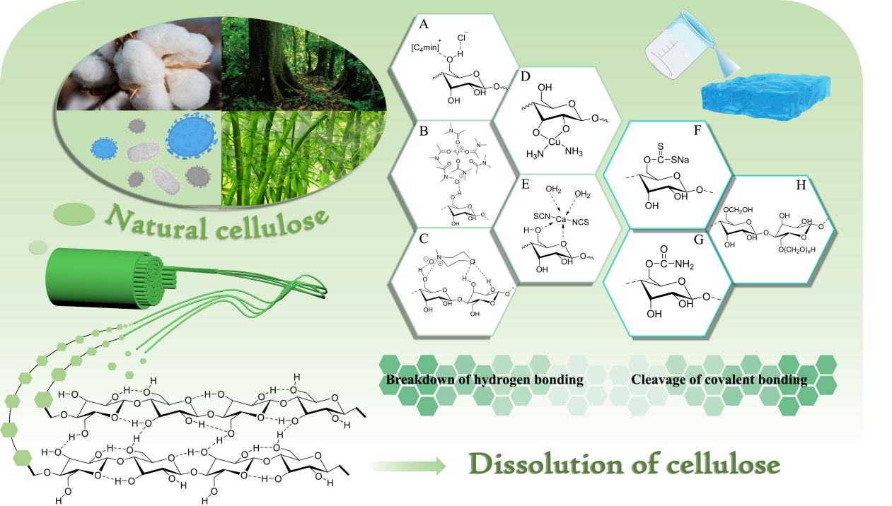 根据纤维素在溶剂中是否发生化学反应,纤维素的溶解体系可分非衍生化和衍生化溶剂溶剂体系,包括离子液体、低共熔溶剂、碱-尿素体系、LiCl/N,N-二甲基乙酰胺、NMMO、铜氨溶液、熔融盐以及季铵盐溶解体系等。其中,离子液体具有可设计性,溶解效率高等优势,在纤维素溶解中表现出极大的潜力,例如有咪唑类、吡啶类、胆碱类和超碱类离子液体;碱-尿素体系由张俐娜院士团队开发,碱的种类对溶解效果影响较大,由于碱/尿素和NaOH/硫脲水溶液体系只能溶解草浆、甘蔗渣浆等低聚合度的纤维素,且纤维素在预冷溶剂中存在分散不均匀、易发生凝胶化、溶解条件苛刻等问题,阻碍了该体系的工业化进程。