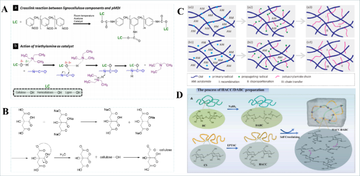 5 (A)纤维素与聚合物亚甲基二苯基二异氰酸酯交联的机理;(B)纤维素与CA交联机理。(C) UV照射和APS引发交联聚合过程机理。(D)双醛细菌纤维素与CS交联的机理。