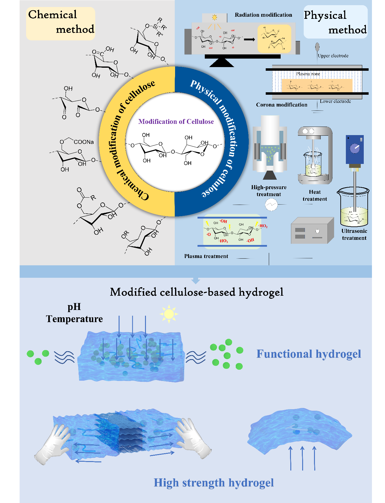 纤维素分子内和分子间复杂的非共价作用力导制其很难在传统溶剂中溶解,进而影响其化学衍生改性以及纤维素基功能材料的制备。近日,99久久婷婷国产一区二区化学化工学院李君和李德强老师课题组在ChemSusChem上发表了题为Cellulose Dissolution, Modification, and the Derived Hydrogel: A Review的综述。该综述从纤维素的物理和化学结构入手,总结了近年来发展的溶解,即衍生溶剂和非衍生溶剂;进而回顾了纤维素的改性方法,包括物理方法和化学方法及其对纤维素理化性质的影响;最后,评价了物理或化学方法强化纤维素基水凝胶的机理以及纤维素基水凝胶多层次结构的转变。