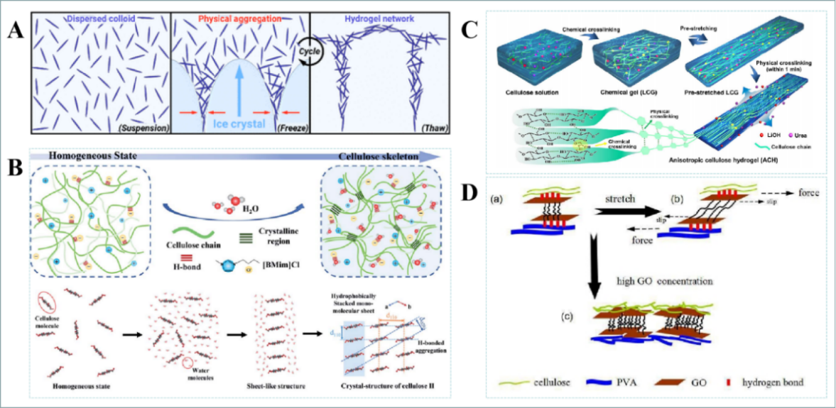 4所示。(A)纤维素水凝胶冻融机理;(B)纤维素水凝胶自组装机理及纤维素间疏水力示意图;(C)预拉伸各向异性纤维素水凝胶;(D)再生纤维素/氧化石墨烯(GO)/聚乙烯醇(PVA)复合水凝胶断裂伸长率增强示意图。