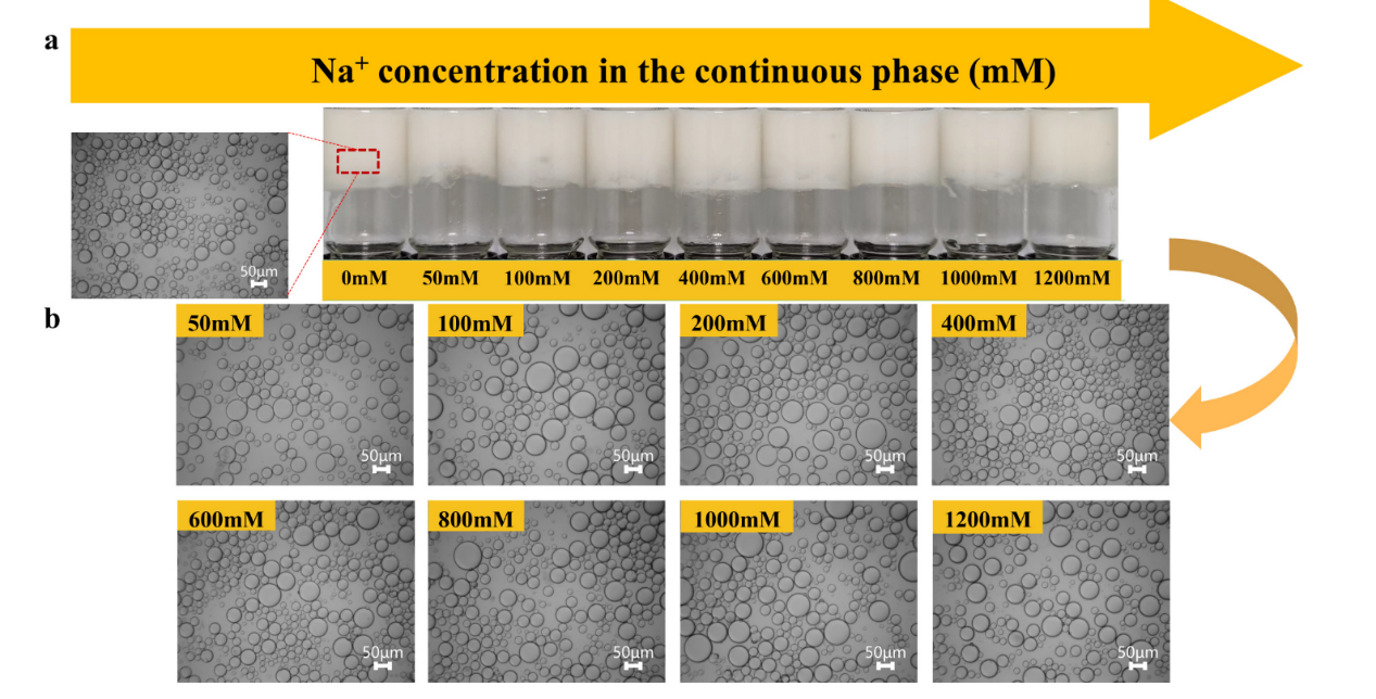 2. 制备的MANCs-HIPPEMANCs浓度为2wt%,φ0.8)对NaCl0-1200 mM)的稳定性:(a)数码照片;b)光学显微镜图像。