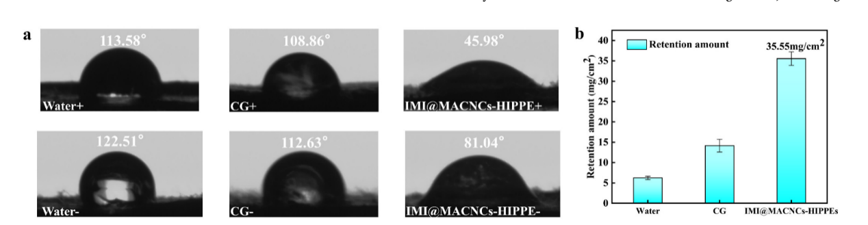 3. IMI@ MACNCs-HIPPEs在棉花叶面表面的铺展和滞留实验:(a)接触角(+-表示棉叶的正面和背面);(bIMI@ MANCs-HIPPEs的滞留量。