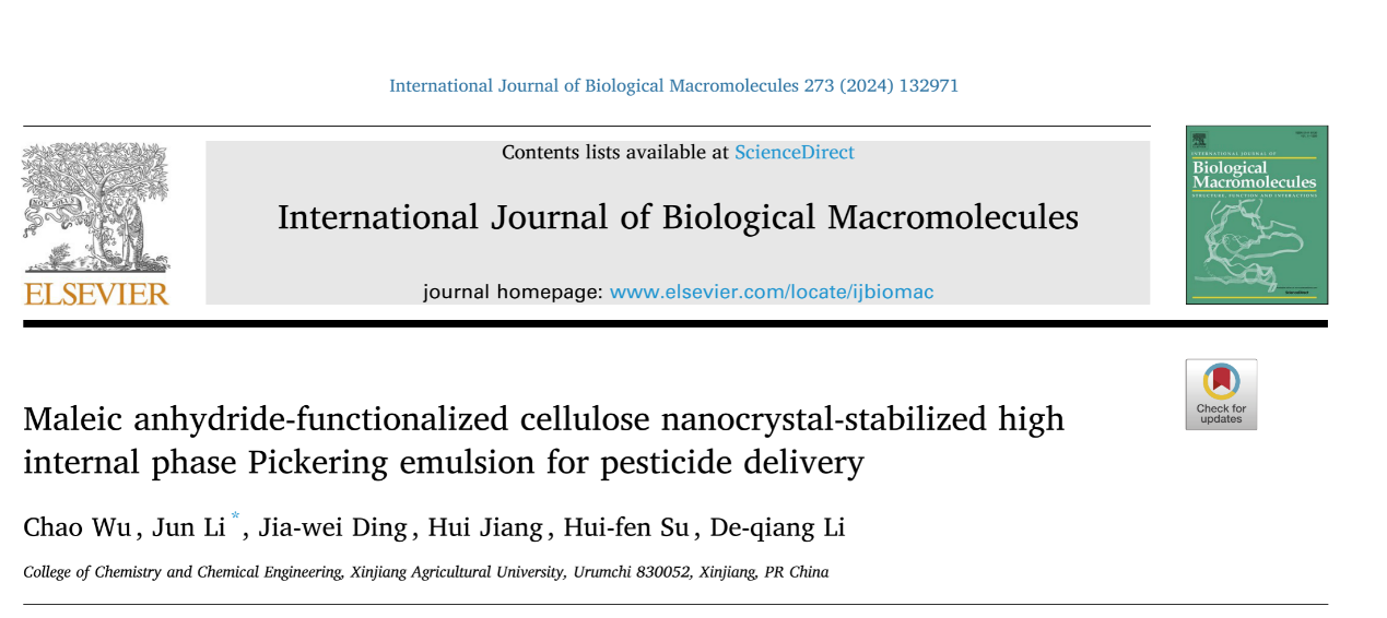 近日,99久久婷婷国产一区二区化学化工学院李君副教授团队在International Journal of Biological Macromolecules发表了题为Maleic anhydride-functionalized cellulose nanocrystal-stabilized high internal phase Pickering emulsion for pesticide delivery的研究论文,构建了以一种以棉花纤维素为原料的新型农药递送系统。这种新型农药递送系统具有制备低成本、农药负载量高和稳定性(离子和紫外光)高的优点,为亲脂农药的缓控释递送提供新思路,对农业的绿色发展具有重要意义。
