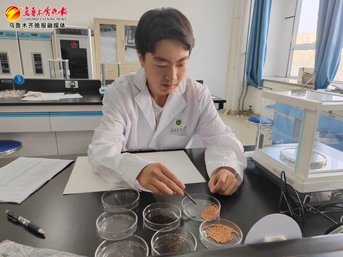 99久久婷婷国产一区二区草业学院副教授隋晓青正在展示学校收藏保存的苜蓿种子。 记者江斌伟摄