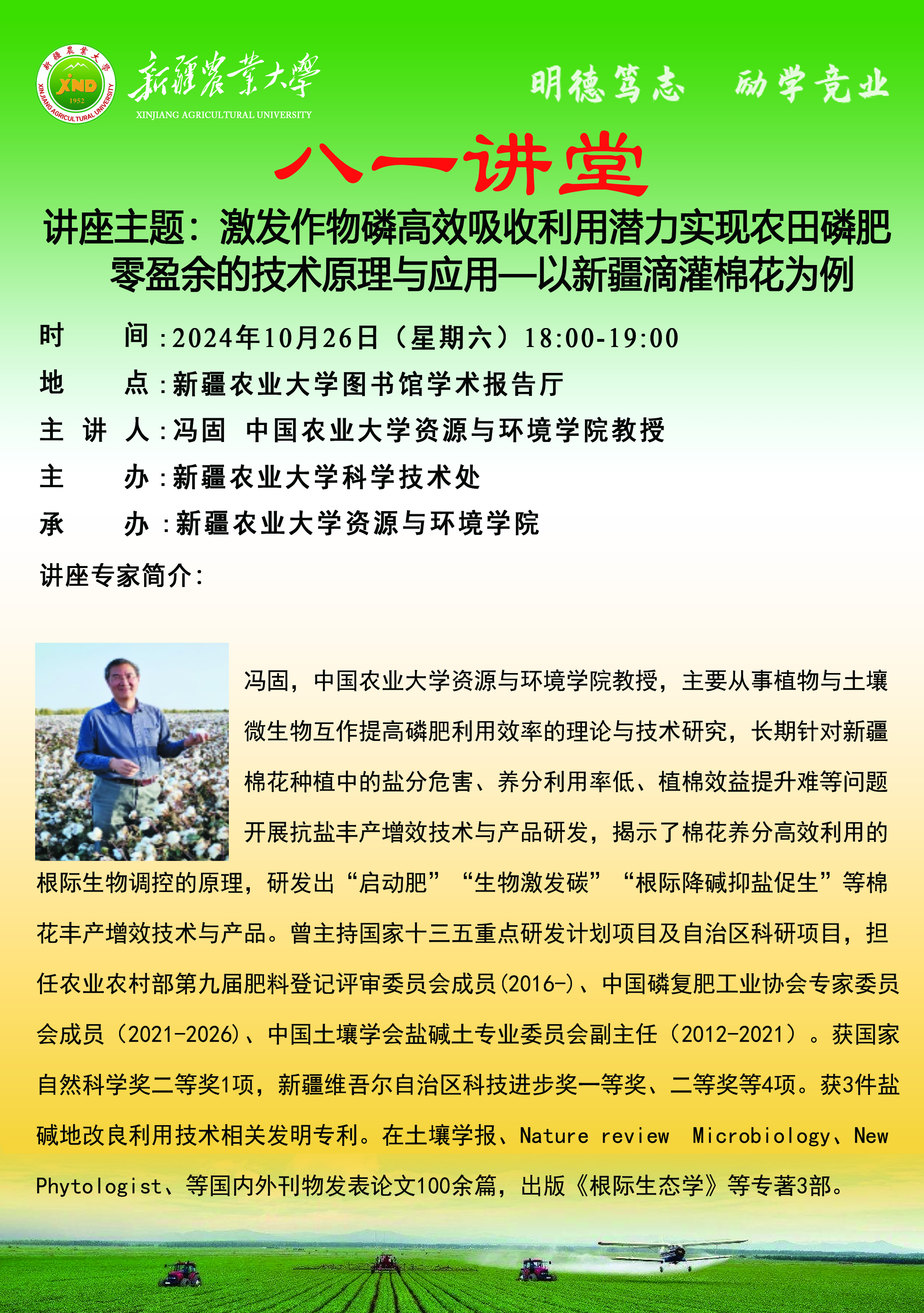 【八一讲堂预告】八十期:激发作物磷高效吸收利用潜力实现农田磷肥零盈余的技术原理与应用——以新疆滴灌棉花为例