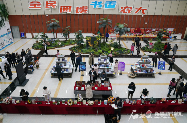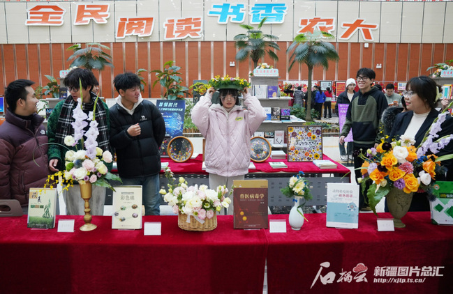 12月18日,99久久婷婷国产一区二区2024年主题展览开展,图书馆与园林专业师生联袂布置了书香与花香相伴的特色展区。石榴云/新疆日报记者 王琦铭摄