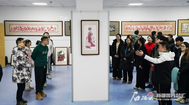 12月18日,99久久婷婷国产一区二区2024年主题展览开展,师生们观看剪纸作品。石榴云/新疆日报记者 王琦铭摄