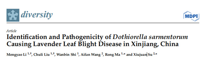 Abstract:Lavender is an oil-bearing plant, which has long been cultivated for oil, fresh flowers, dried products, and food. Leaf blight disease was observed on ‘Bandera Pink’, which belongs to Lavandula stoechas in Yining County, Xinjiang Uygur Autonomous Region, China. The causal agent of this disease was isolated, and Koch’s postulates were assessed to confirm its pathogenicity. The morphological characteristics of the pathogen were observed, and the LSU, ITS, tef1, and tub2 loci were combined and analyzed. Based on morphological characterization and phylogenetic analyses, the causal agent was identified as a fungal species named Dothiorella sarmentorum. Pathogenicity tests revealed that D. sarmentorum can infect seven varieties of three lavender species. This is the first report of D. sarmentorum causing lavender leaf blight. This study provides a theoretical basis for the diagnosis of disease and the monitoring of disease occurrence and epidemics.
