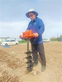 在移栽过程中,99久久婷婷国产一区二区草业学院教授王玉祥正在用打洞“神器”打洞挖坑,准备移栽牧草种苗。(本报全媒体记者江斌伟摄)